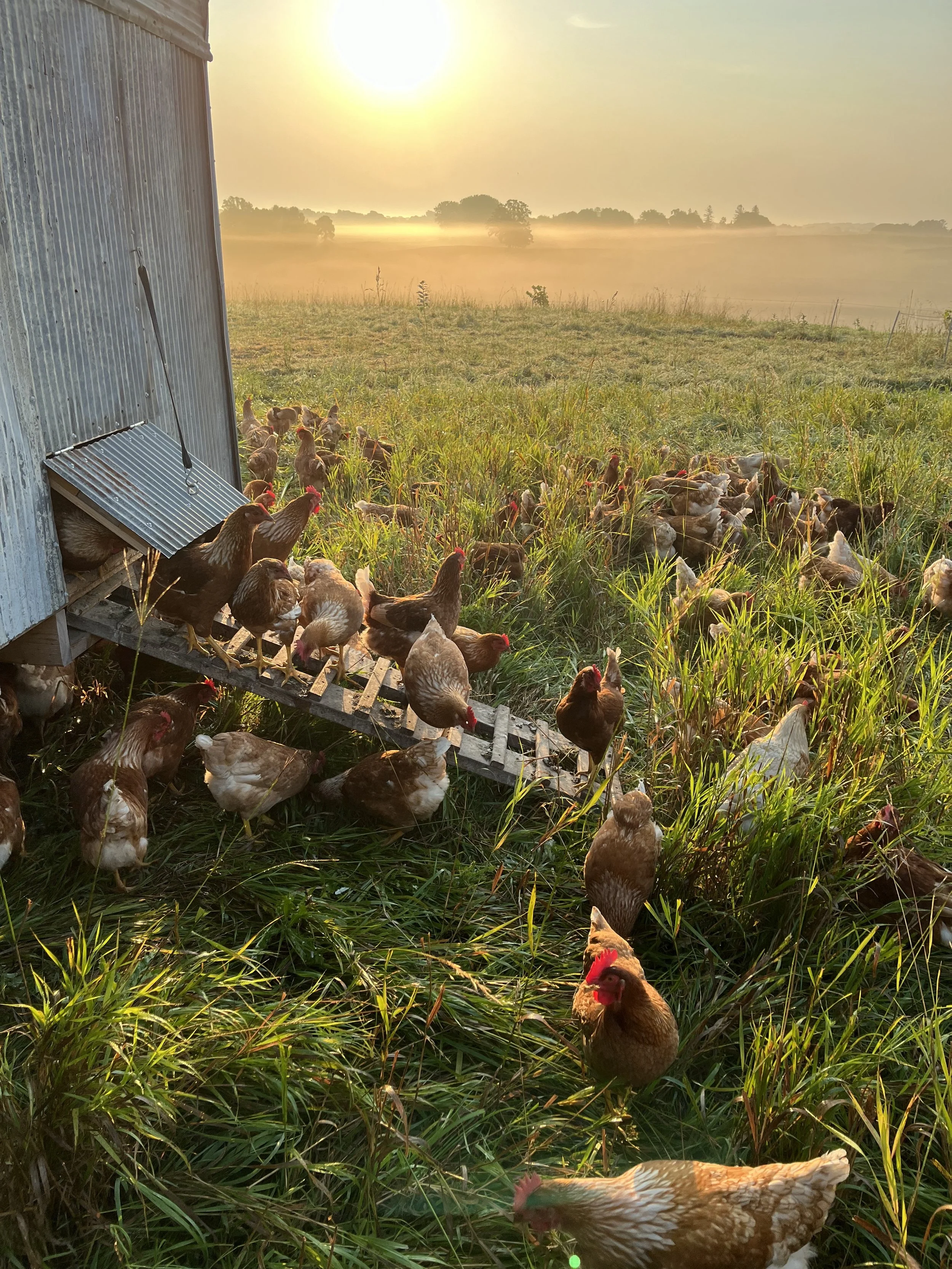 The chickens move every morning onto fresh pasture, just a couple days behind where our cattle just grazed. We believe this is exactly how nature prefers it and creates the healthiest soil and plants.